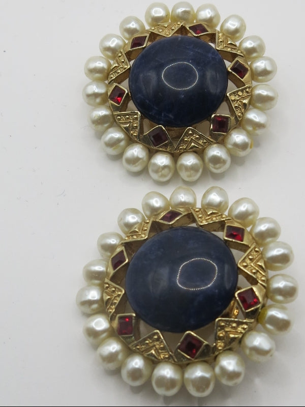 Description: vintage lucite stone and pearl clip earrings with bezel set ruby red glass and gold accents, small pearls arranged in circle design around the edge.