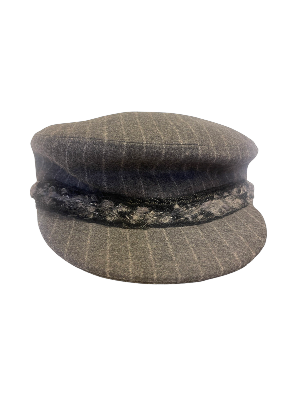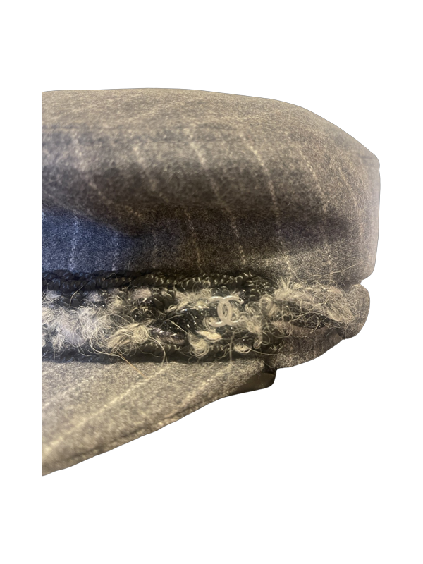 Description: Chanel cap, wool pinstripe baker boy hat, rare with silver thread through trim on peak and silver "Chanel" cc never used. Brand new condition.
