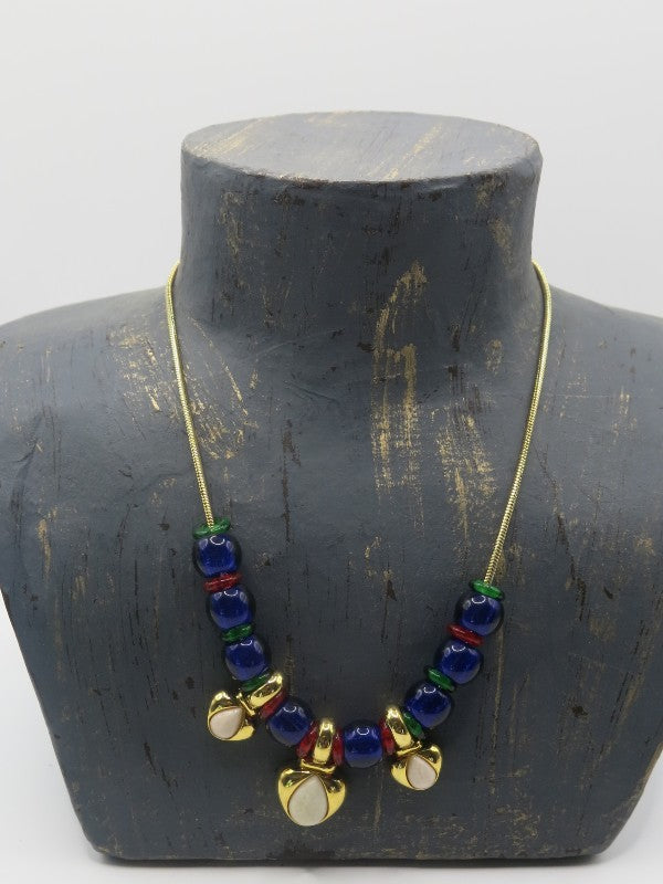 Description: Slider necklace rare vintage with enamal and gold design cabochons, blue glass and faux pearls