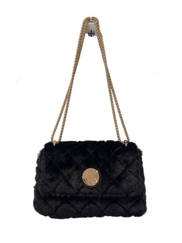 Description: Diamando bag; Rectangular quilted faux fur crossbody bag with long double handles and gold hardware