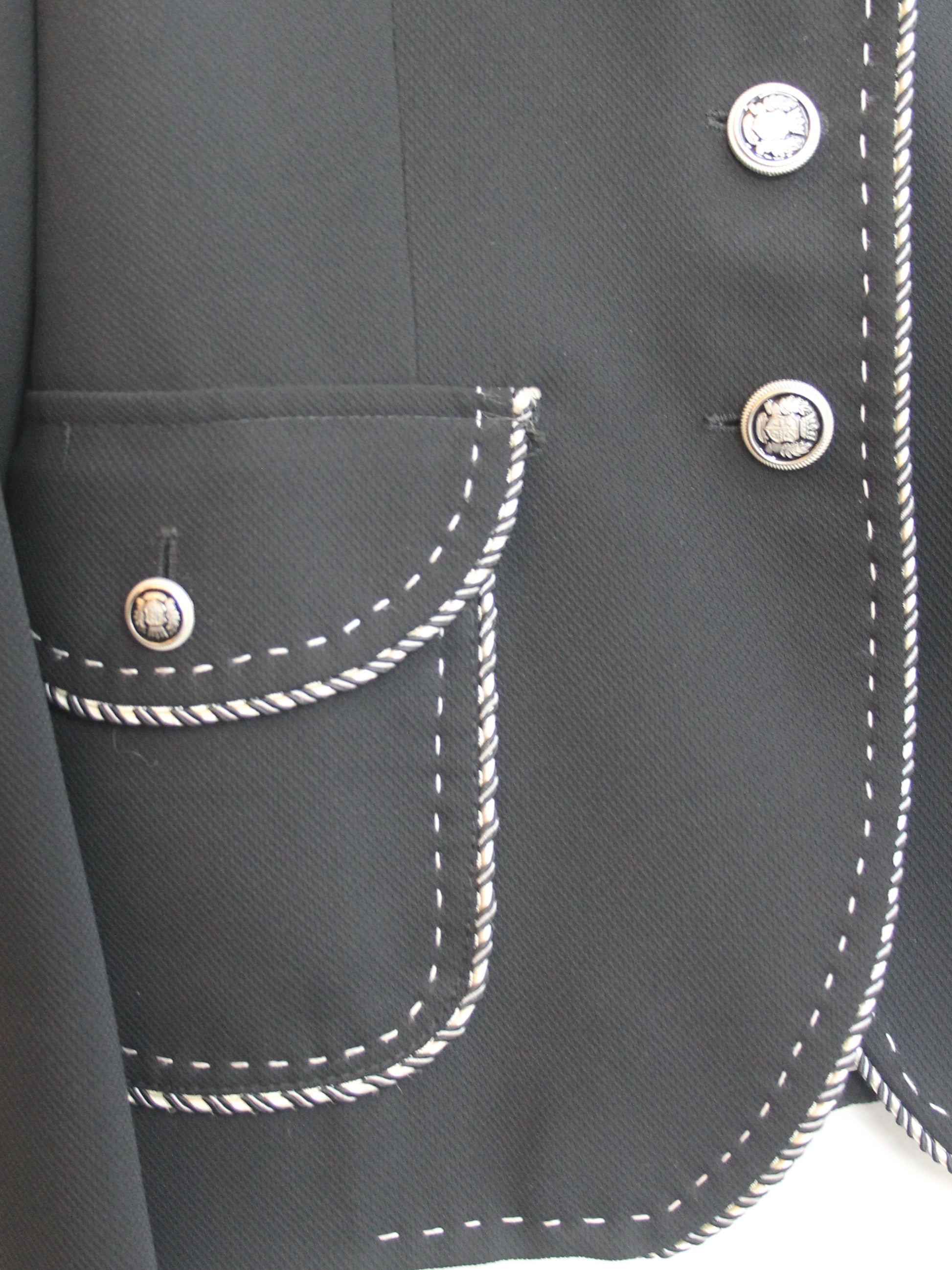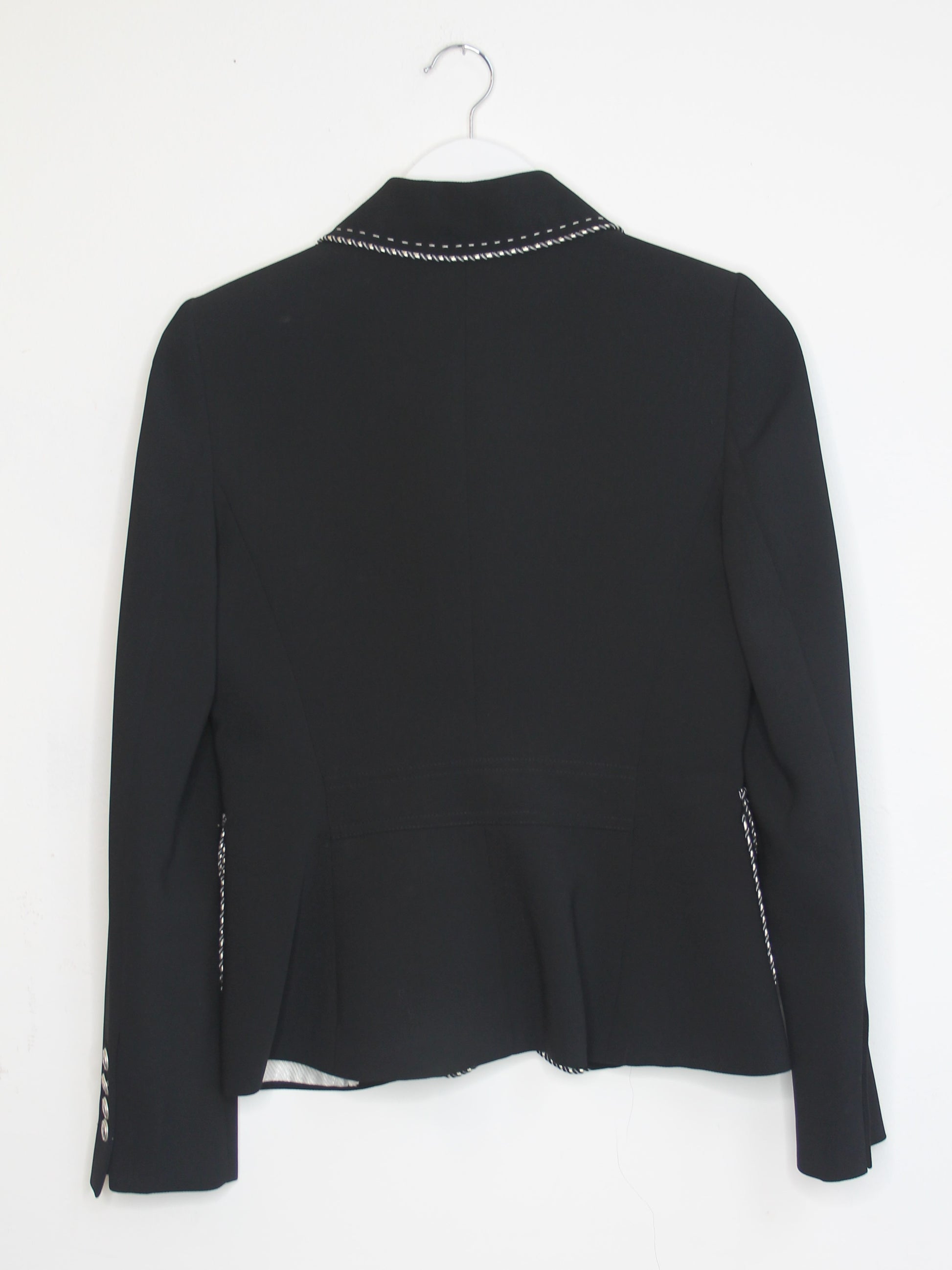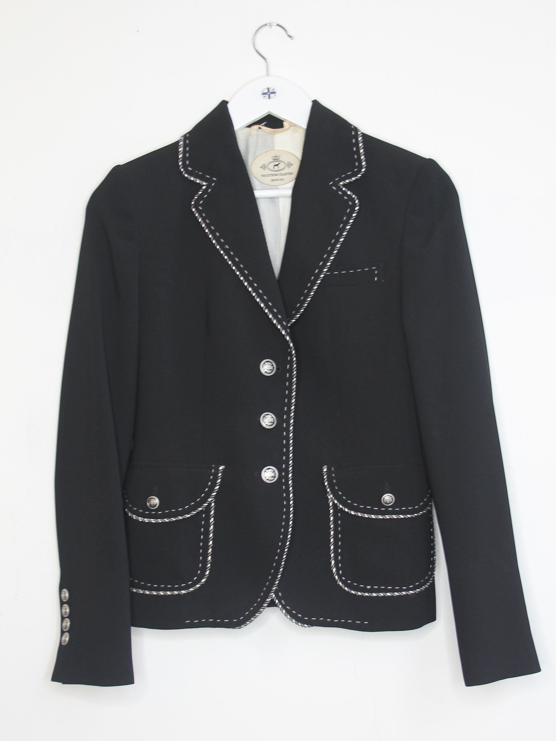 Description: Classic single breasted jacket with patch pockets and black & white piping. Fabric, fine wool twill with light silk lining. A firm favourite for trusted quality, fine fabrics. Stocked exclusively in Wolf and Badger.
