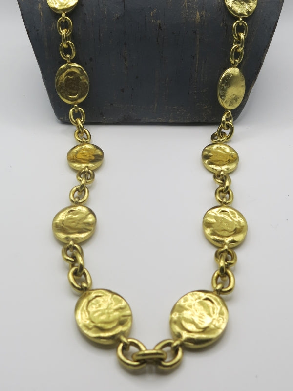 Description: Vintage necklace long, gold chain with heavy gold lozenge charms