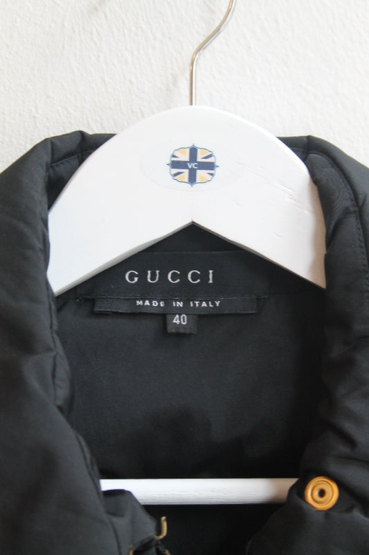 Description: Haute couture jacket. Black athleisure outdoor jacket with gold "Gucci" poppers and gold "Gucci" hardware