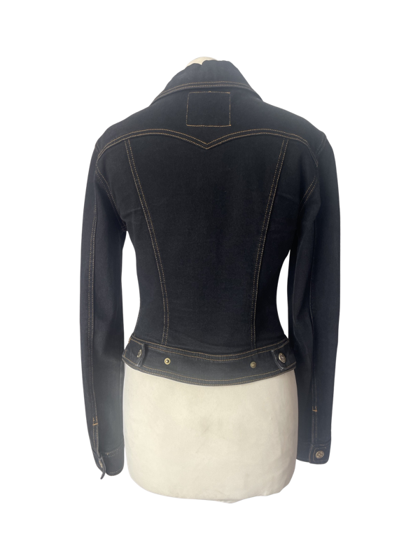 Description: Neat fitted denim jacket, moschino logo buttons, patch breast pockets on the front. Made in Italy flat on front pocket. Pit to pit 17.5” stretch denim.