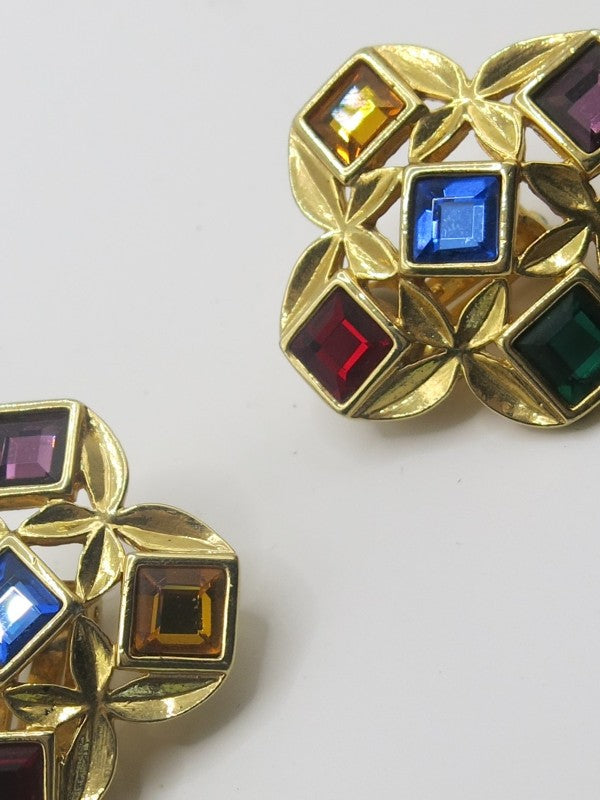 Description: Colourful glass clip on earrings. Matt gold vintage clip earrings with multi coloured poured bezelled glass in geometric design, red blue, purple, yellow and green