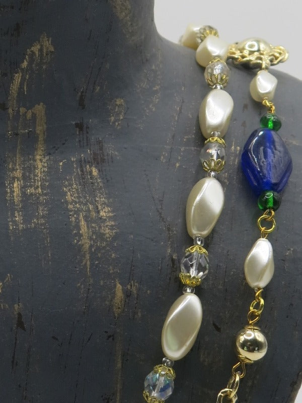 Description: Vintage pearl, crystal and lucite cabochon chain necklace, signed, royal blue, emerald green, filigree encased pearls
