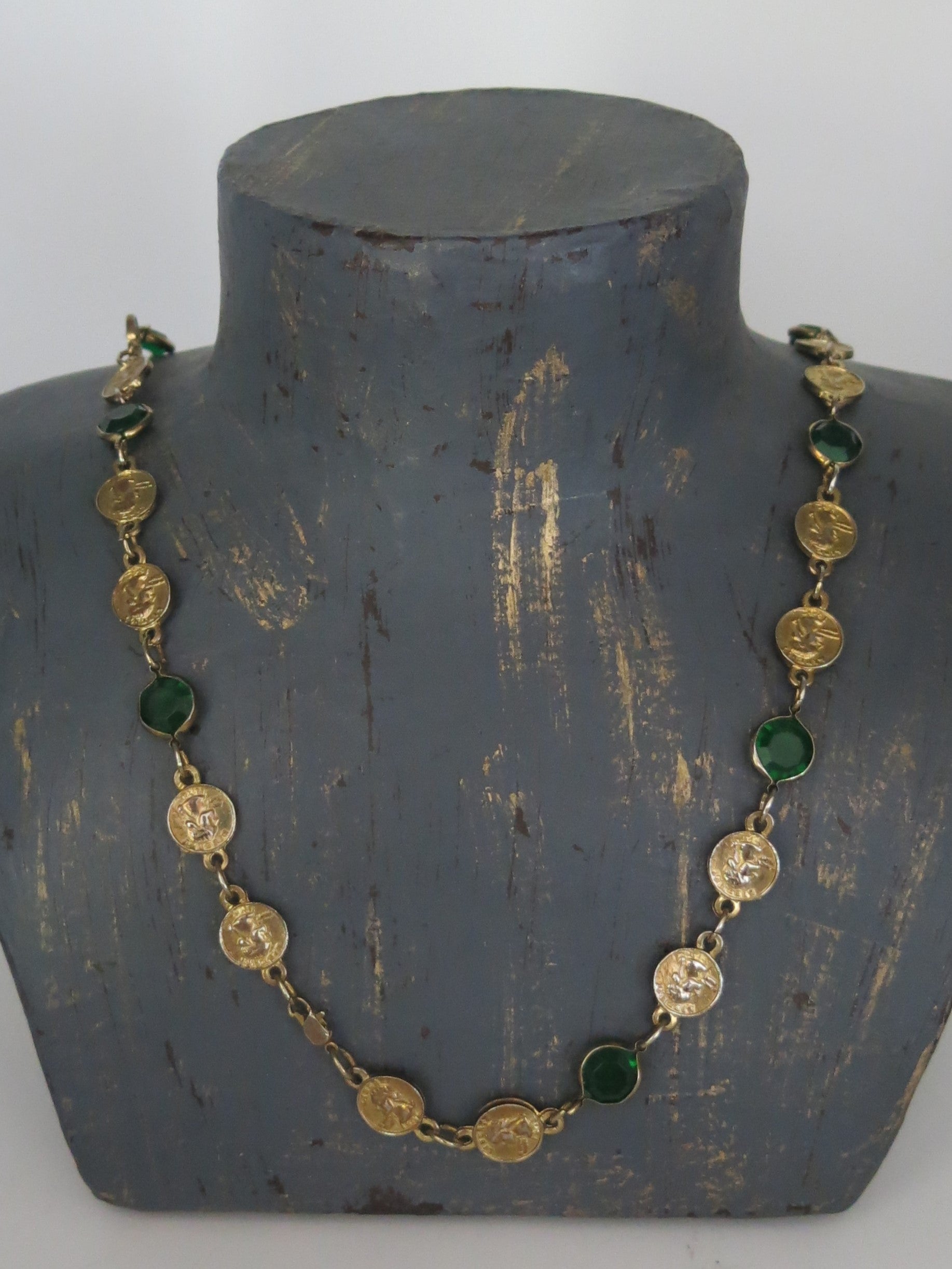 Description: Vintage 1960s emerald green, poured glass faceted bezel link gold tone necklace, renaissance revival style face cameo coin chain necklace, unsigned.