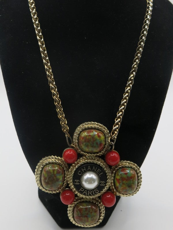 Description: Maltese cross enamel pendant on heavy rope chain, upcycled with an original pearl authentic button centre