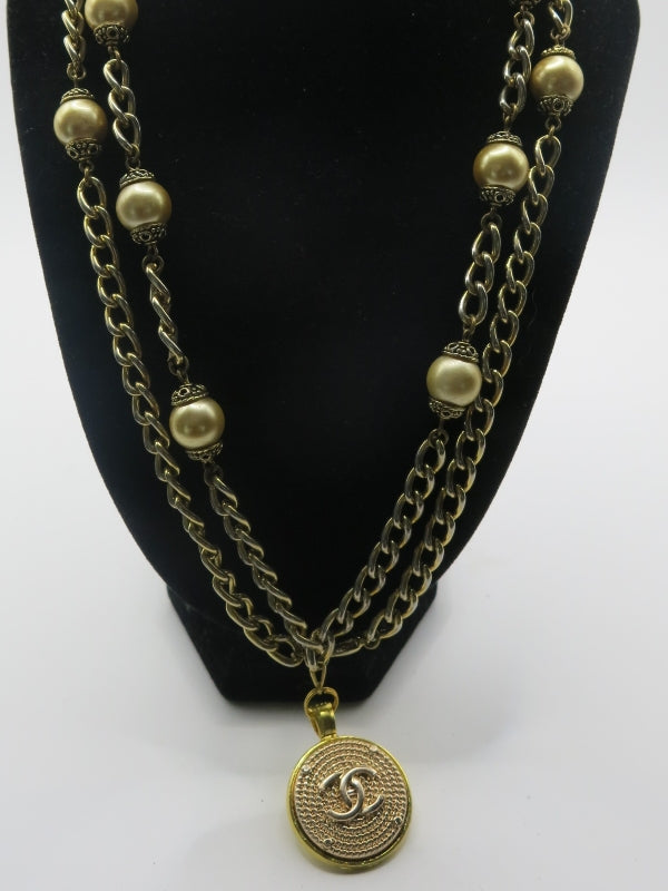 Description: Golden Pearl vintage necklace and old CC button connected together.