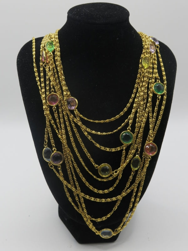 Description: Vintage Gold Tone multi color bezel multi strand necklace, goldette style necklace. Colourful bezel, lavender, yellow, pink and green. Purchased in NYC